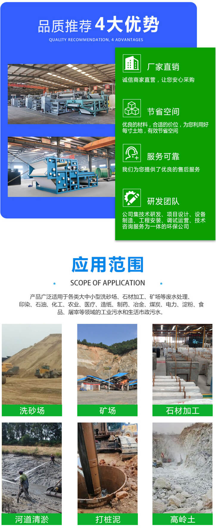 建筑打樁、造紙、皮革紡織、印染、礦山、電渡、洗沙廠泥漿、洗煤、植物渣漿、石材加工、河道淤泥、城市生活污泥的深度脫水處理。